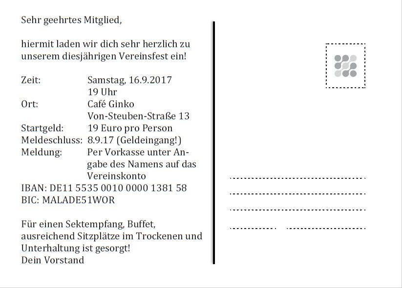 Meldung: Per Vorkasse unter Angabe des Namens auf das Vereinskonto